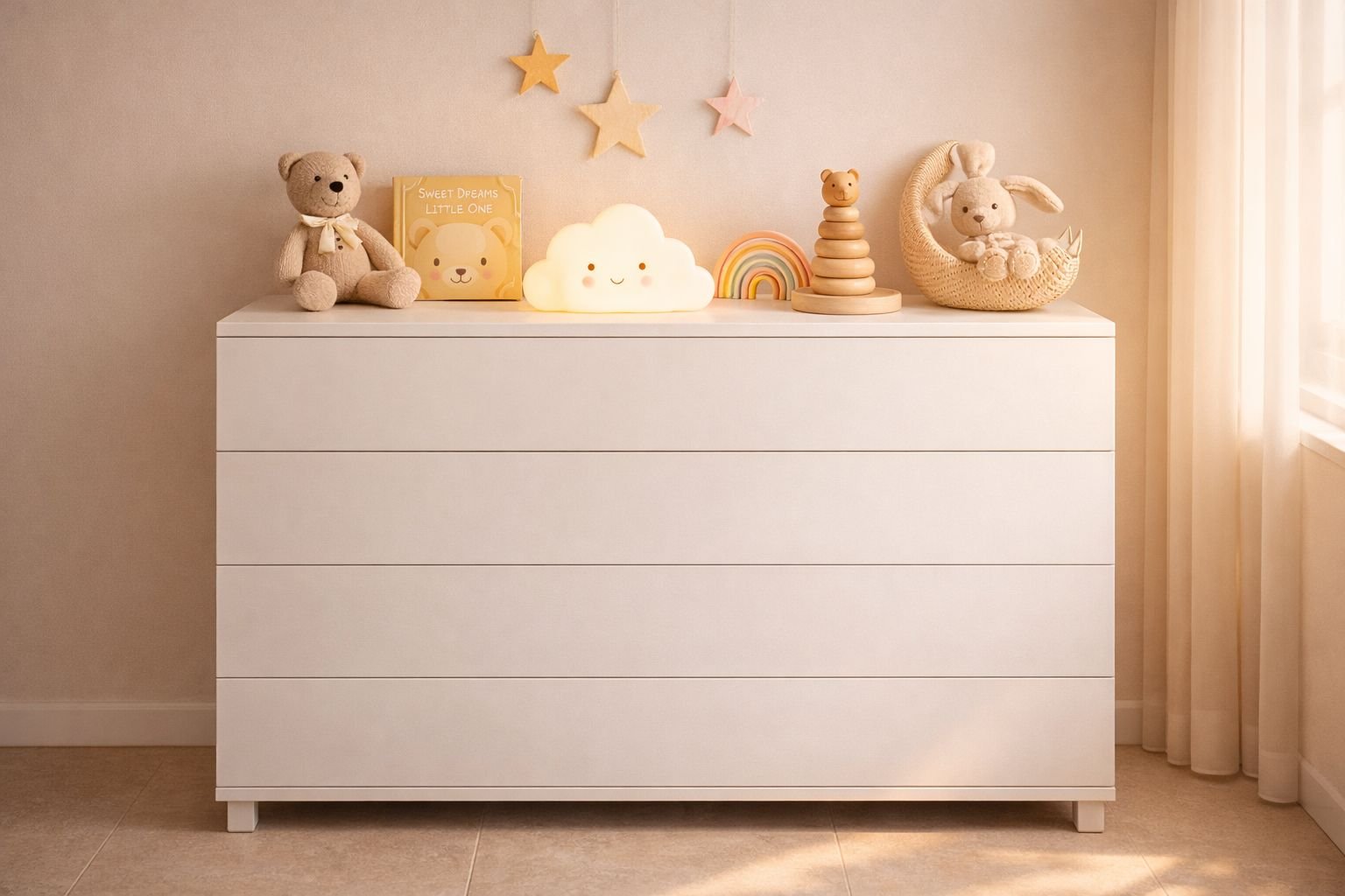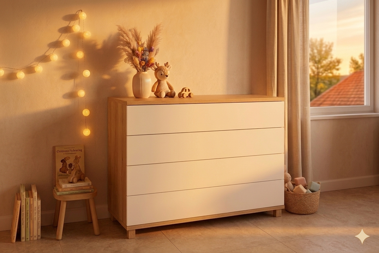 Cómoda de líneas rectas y diseño contemporáneo, ideal para dormitorios infantiles, juveniles o ambientes modernos. Su estética limpia y proporciones equilibradas la convierten en una pieza funcional y versátil, perfecta para optimizar el guardado sin recargar el espacio.