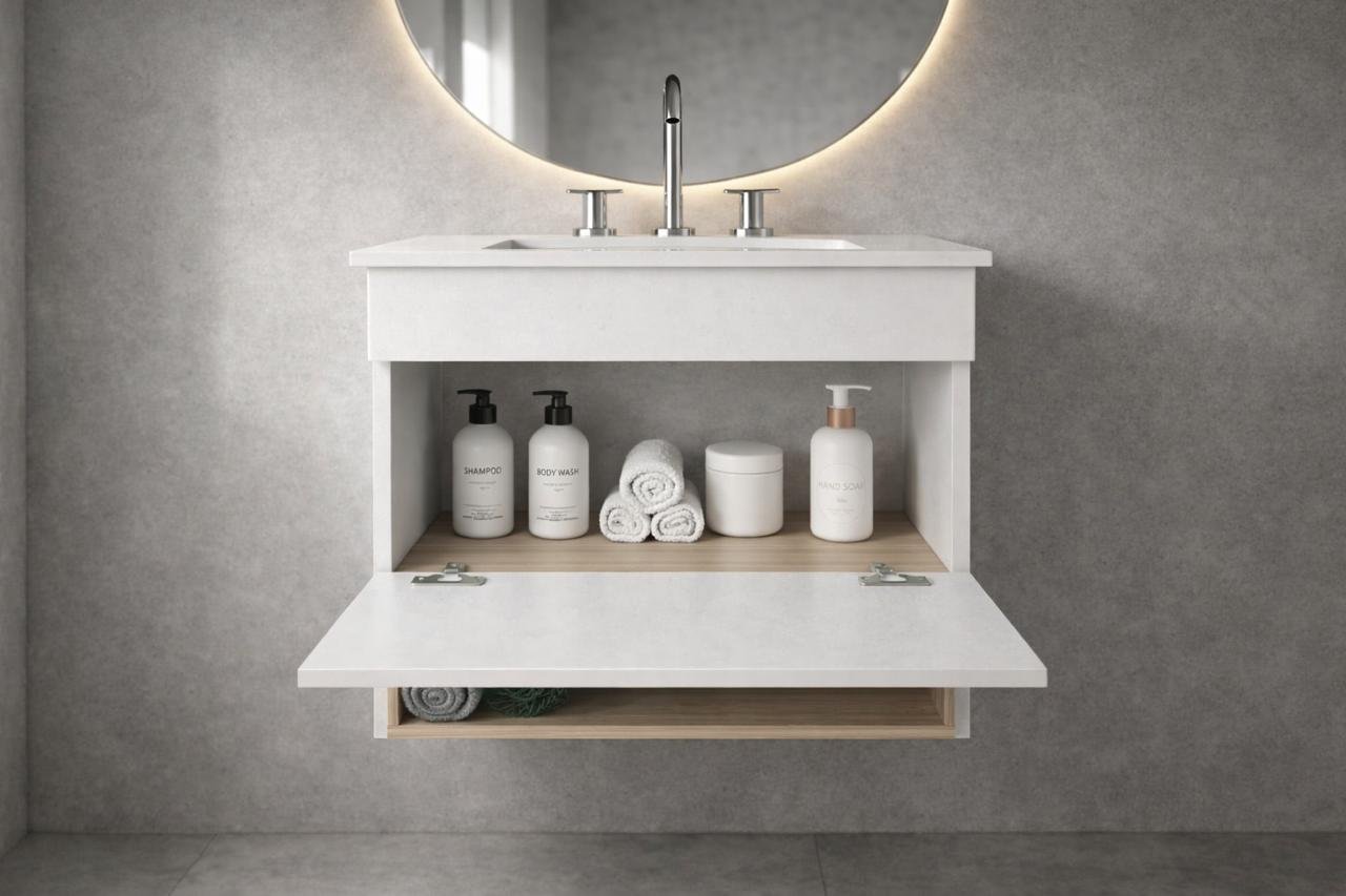 Es una solución ideal para baños modernos, toilettes o departamentos con espacios reducidos, aportando diseño sin perder funcionalidad.